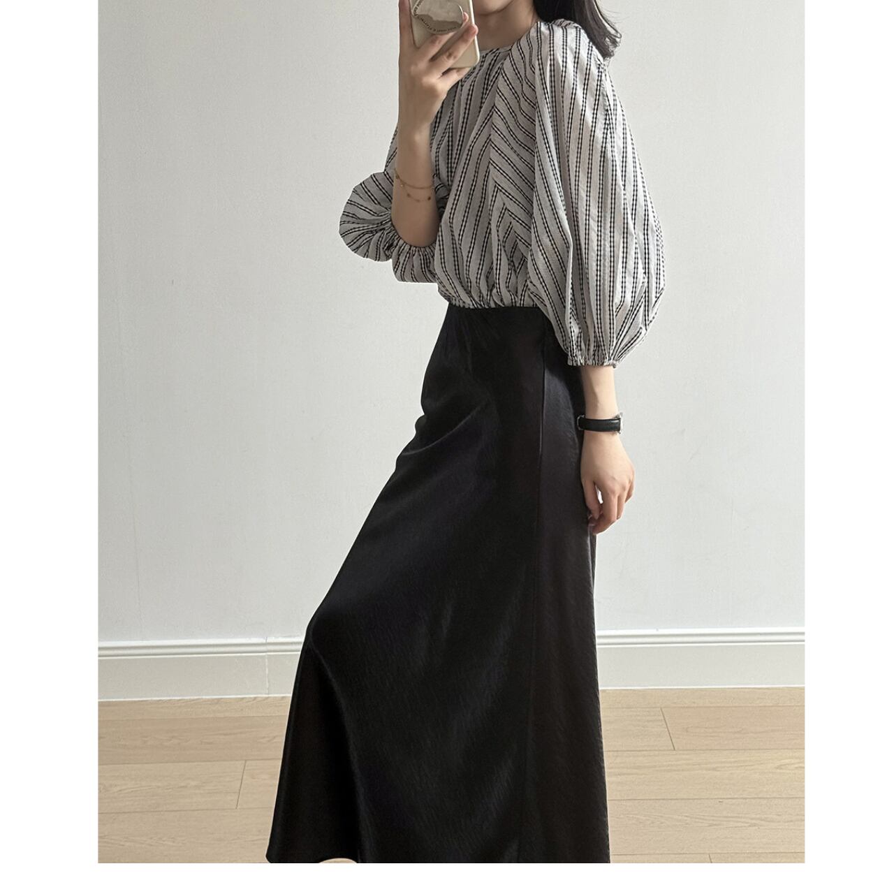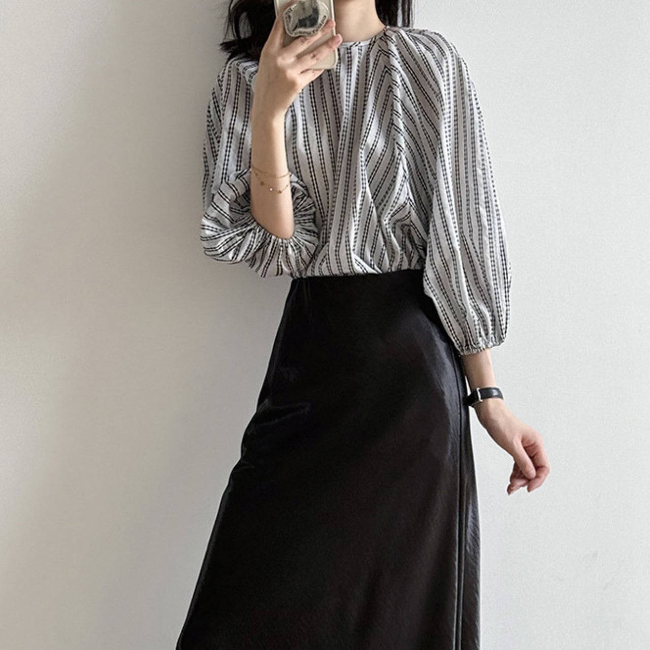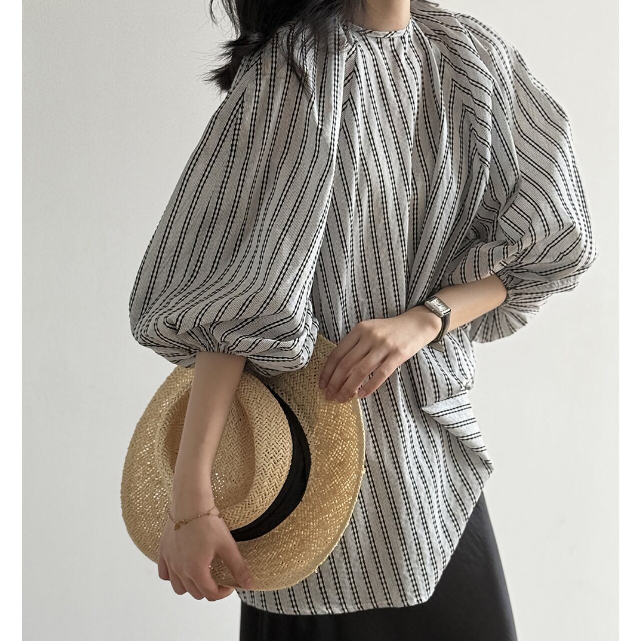 ストライプ柄七分袖バルーンスリーブブラウス 00332