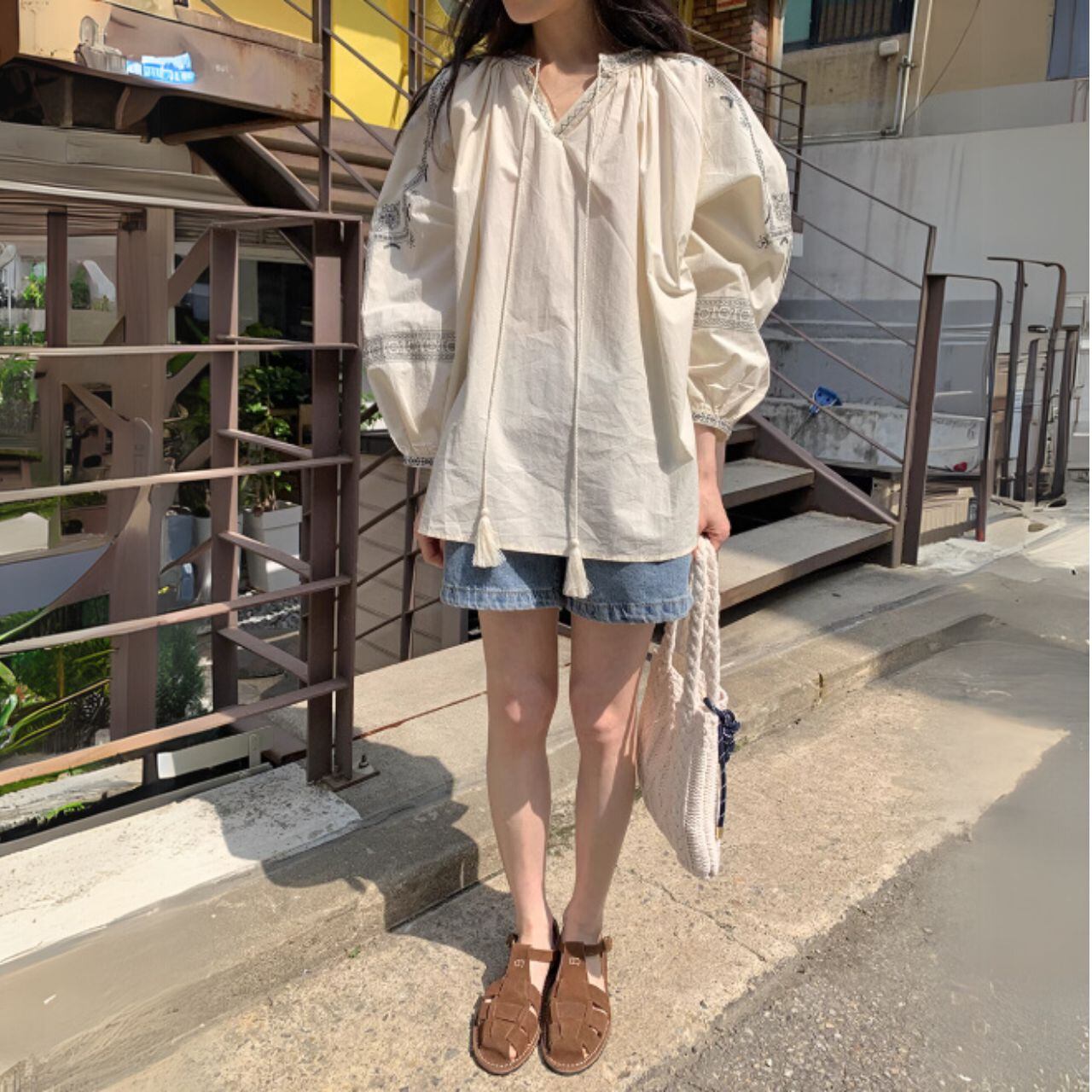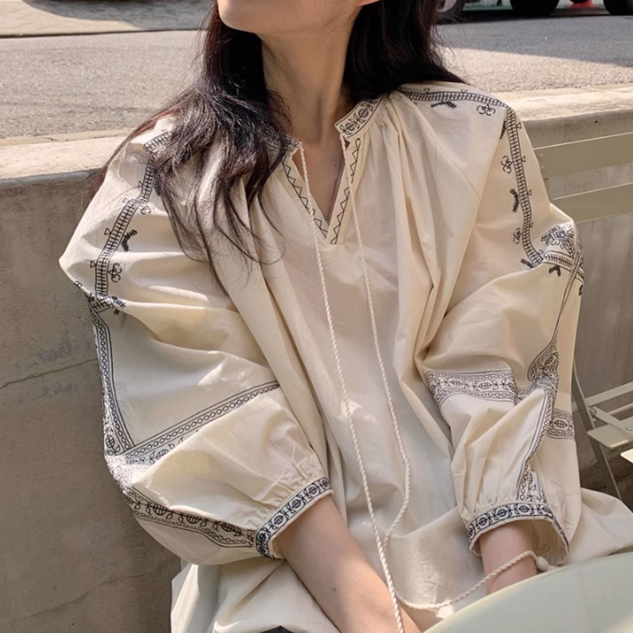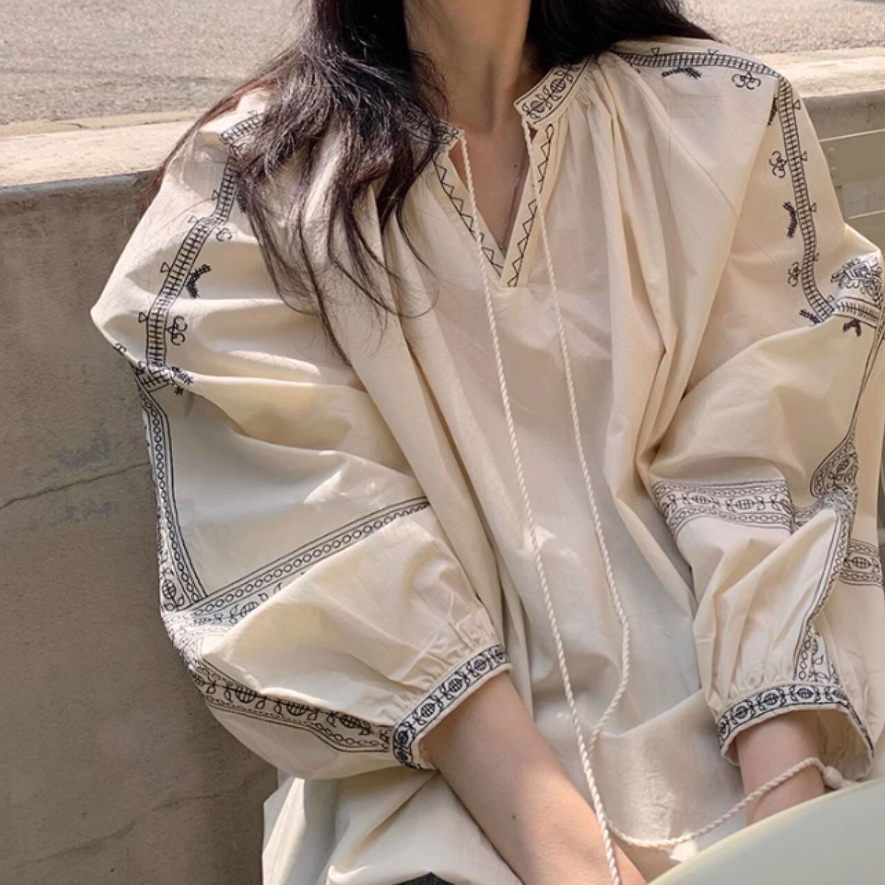 七分袖Vネックバルーンスリーブコットンブラウス 00377
