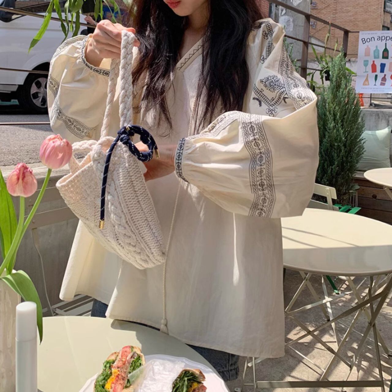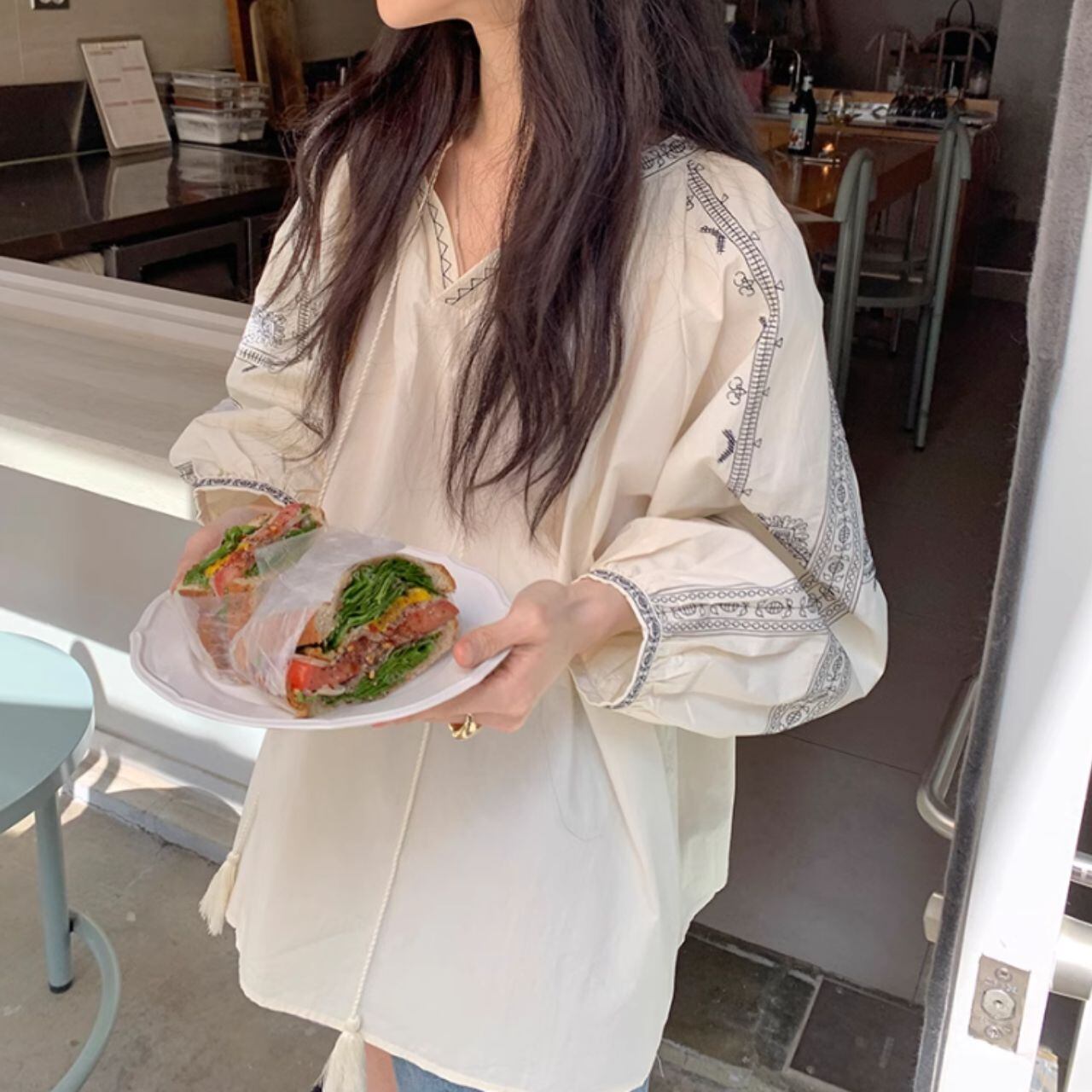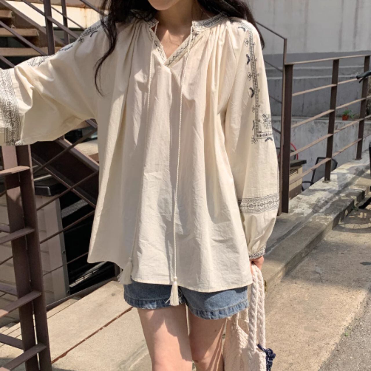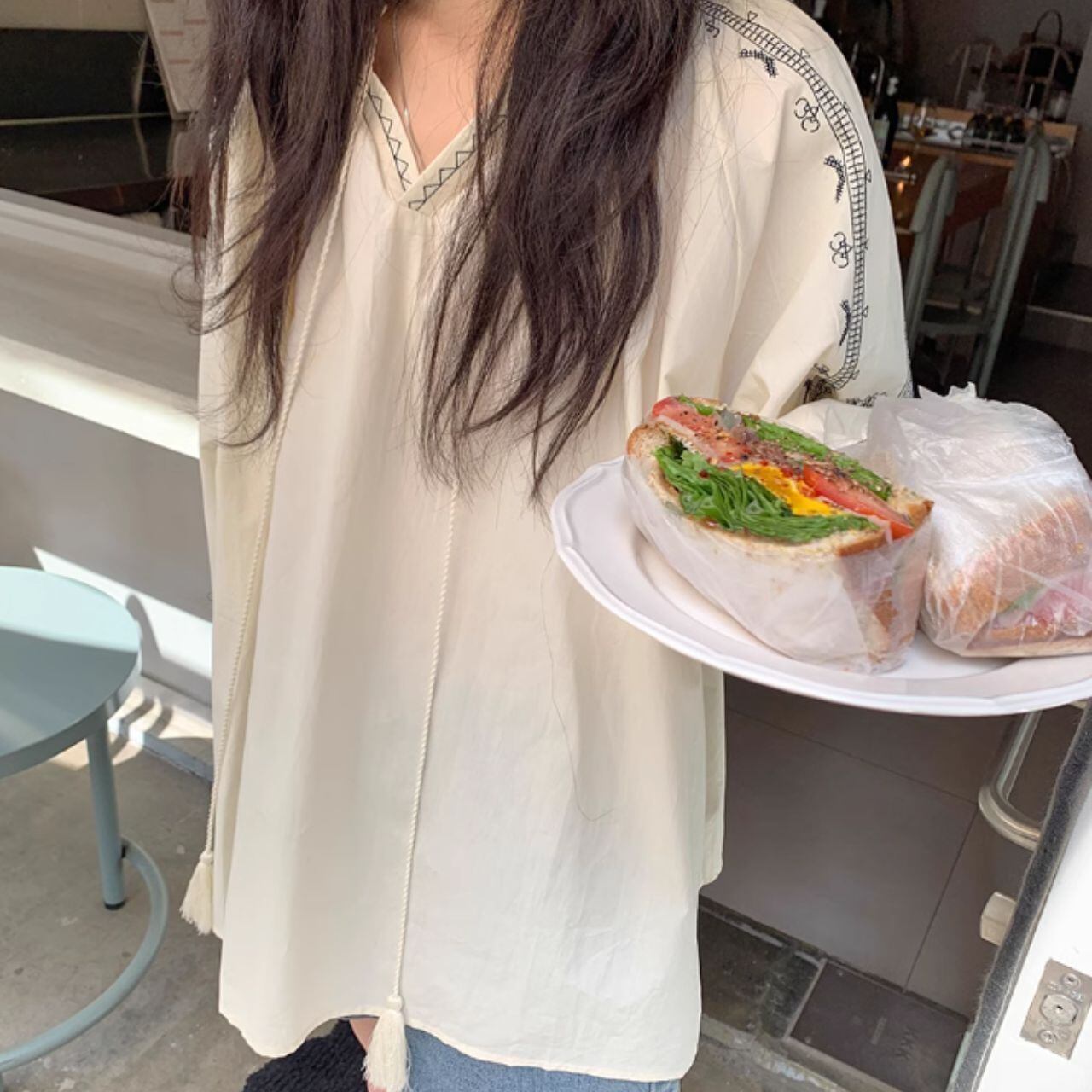 七分袖Vネックバルーンスリーブコットンブラウス 00377