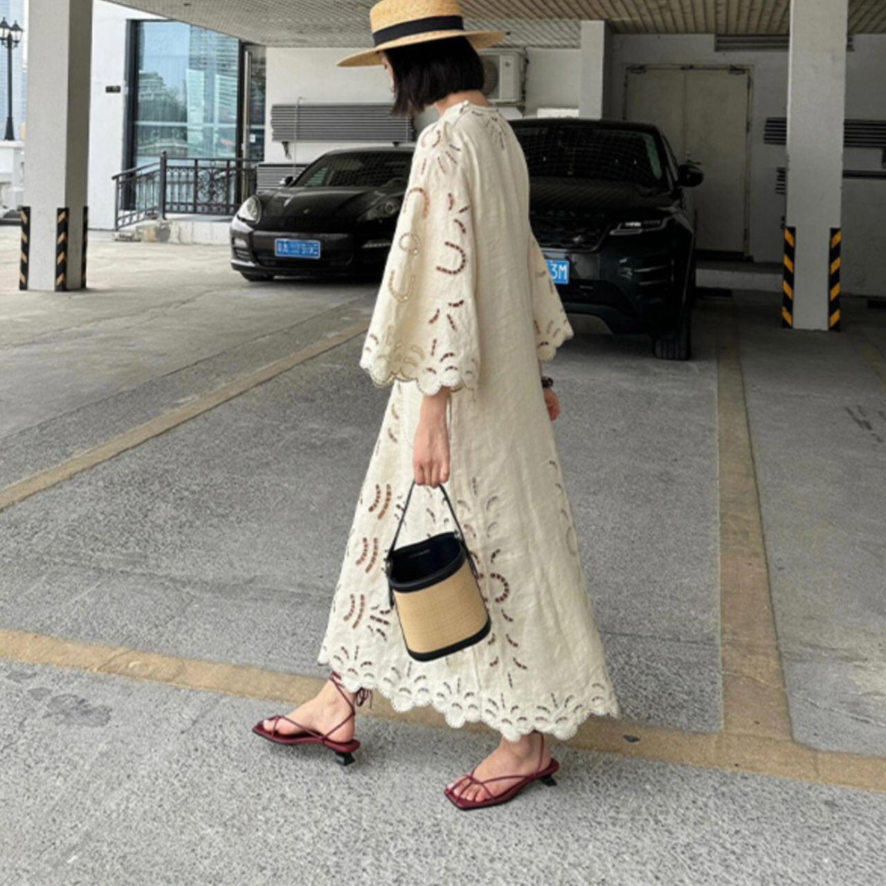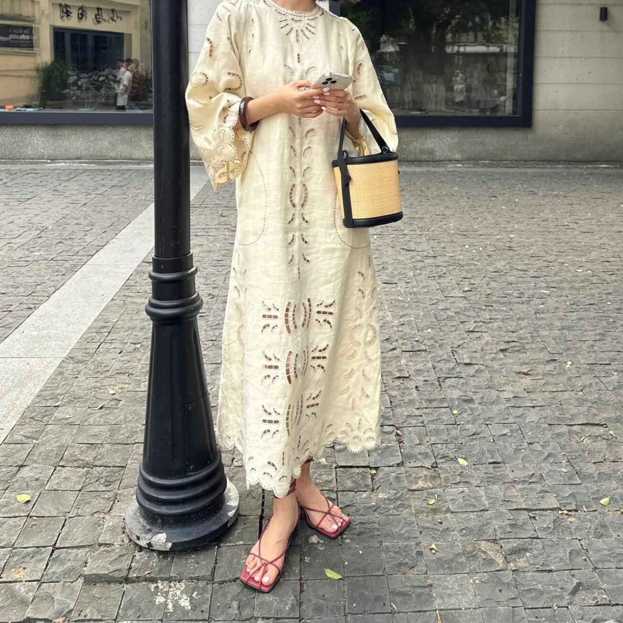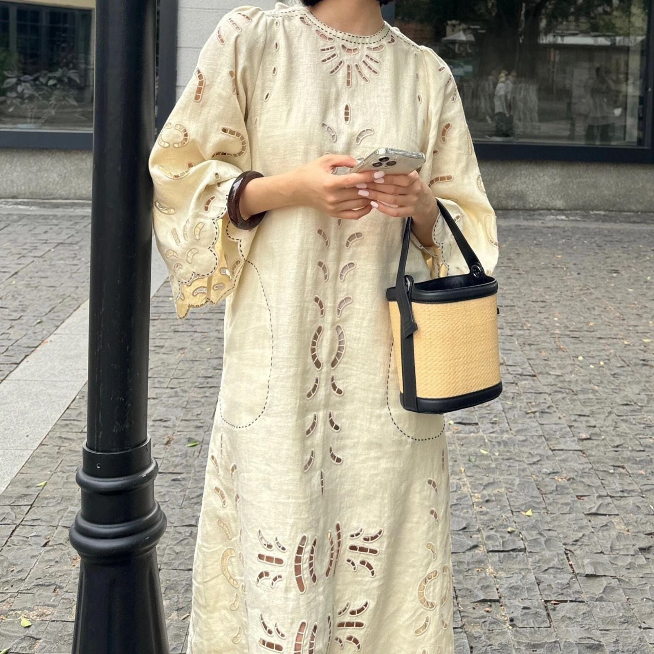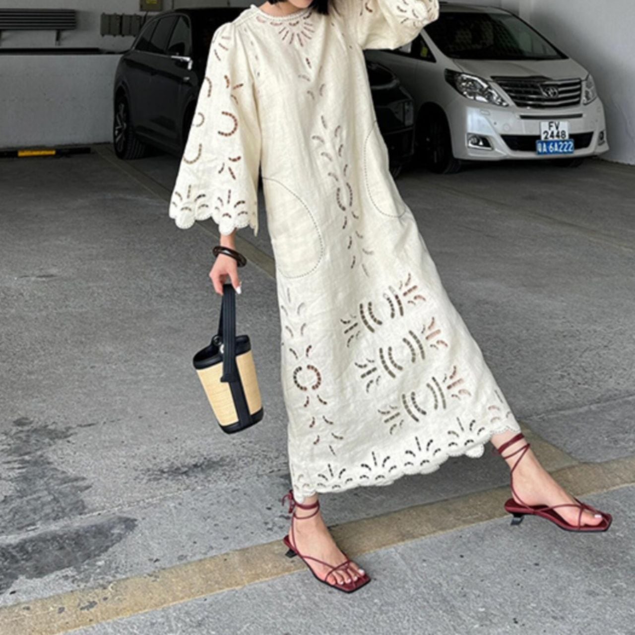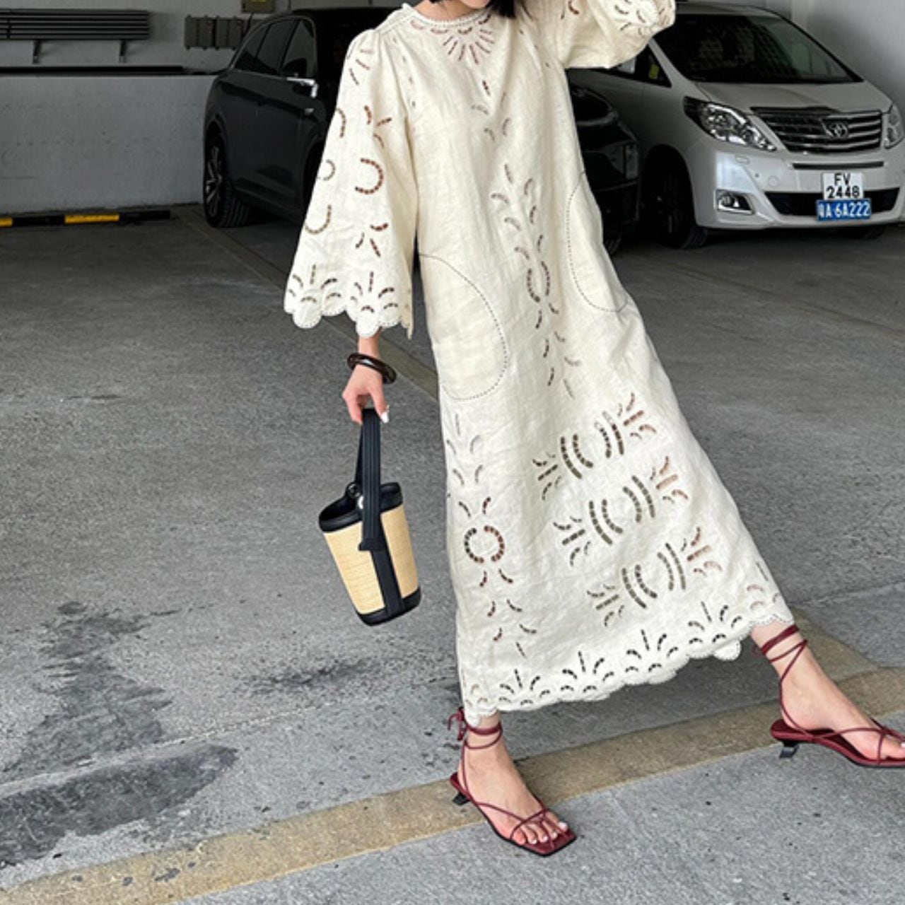 レーザーカットマキシ丈七分袖ワンピース 00599