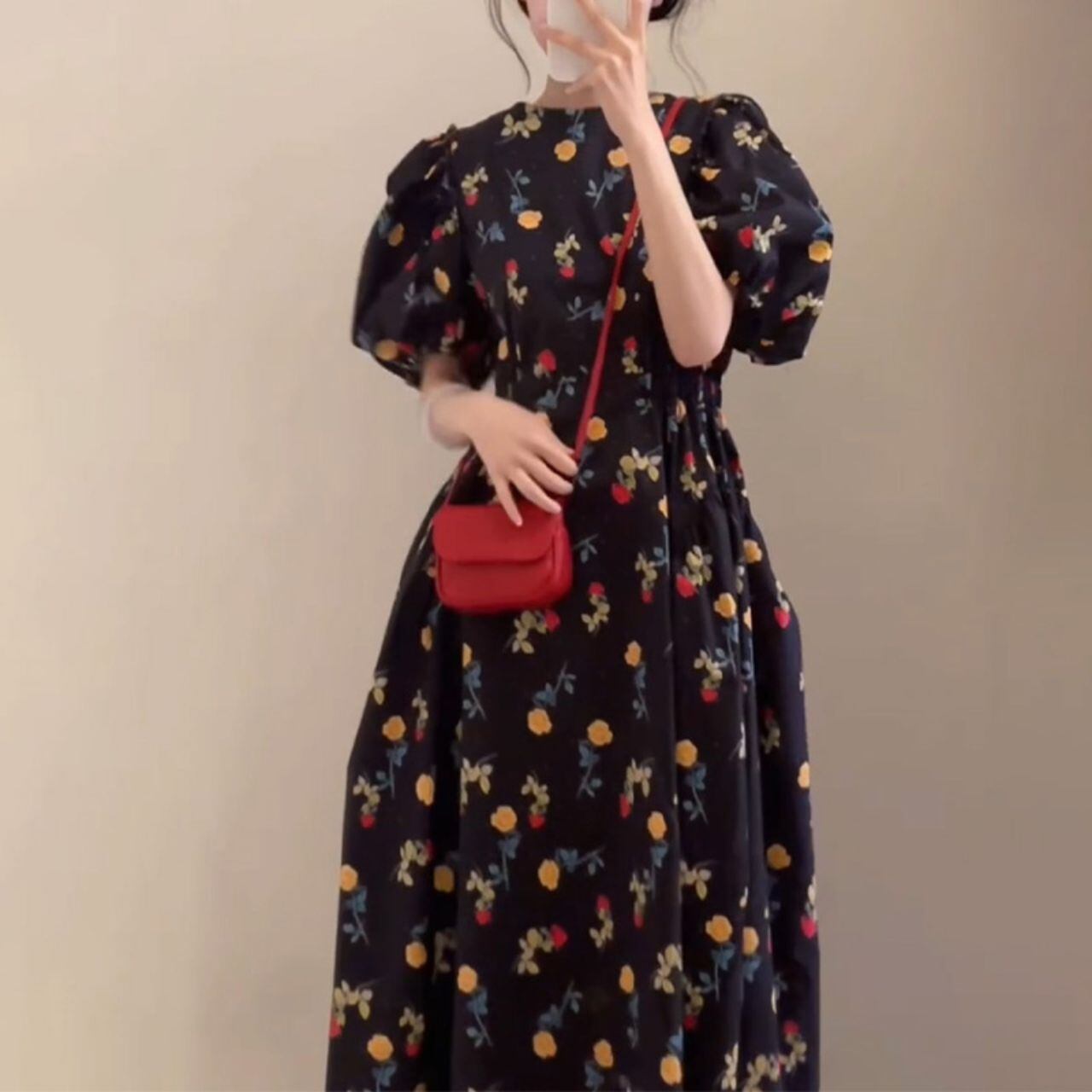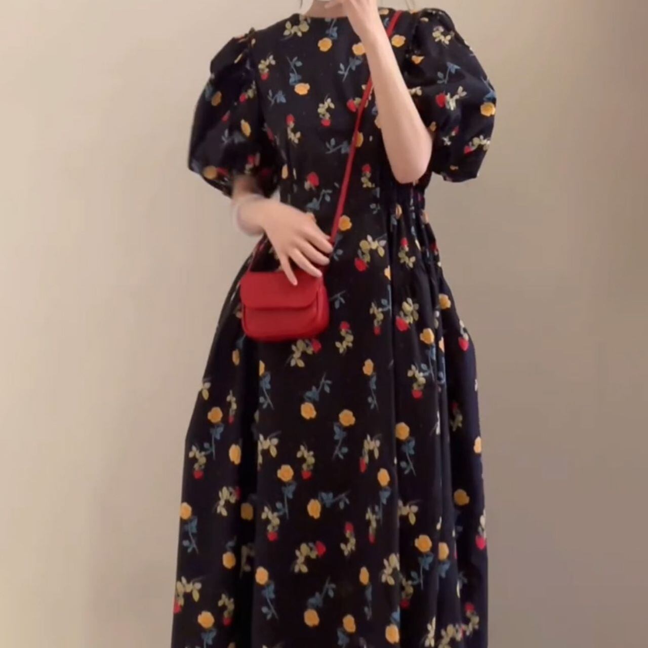 パフスリーブ七分袖Aラインロング丈ワンピース 00598