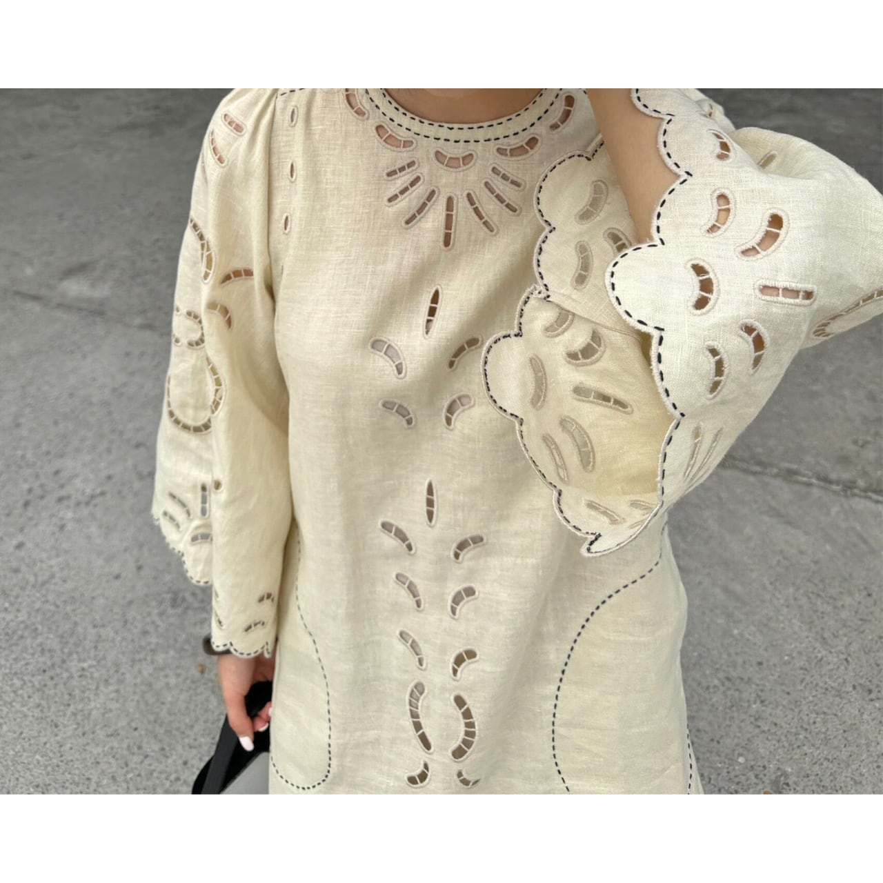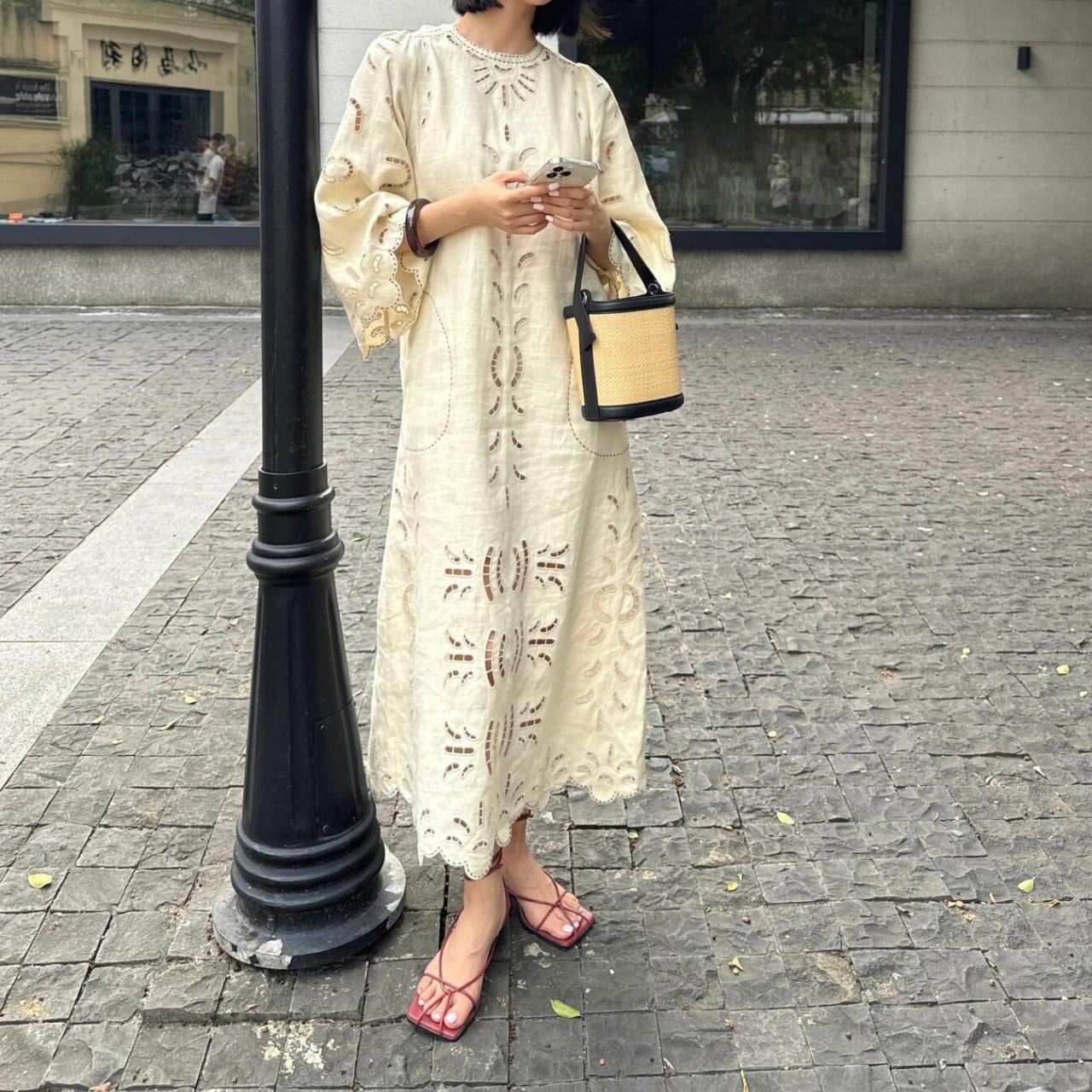 レーザーカット七分袖マキシ丈ワンピース 00695