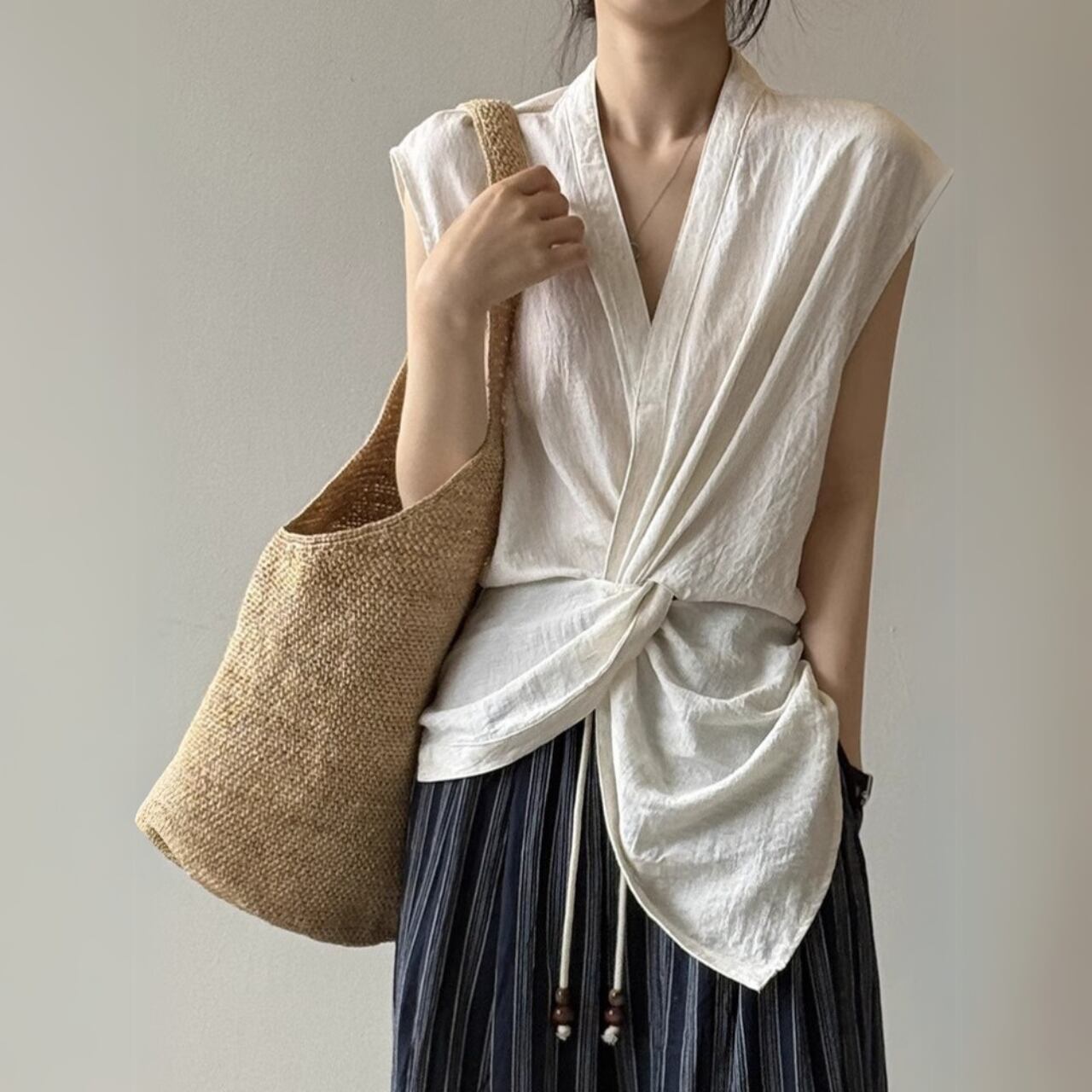 ドレープデザインシンメトリーノースリーブトップス 00726