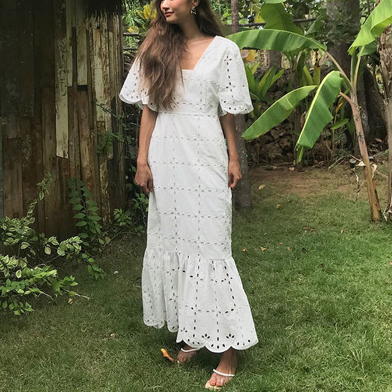 Vネックパフスリーブアイレット刺繍ワンピース 00577
