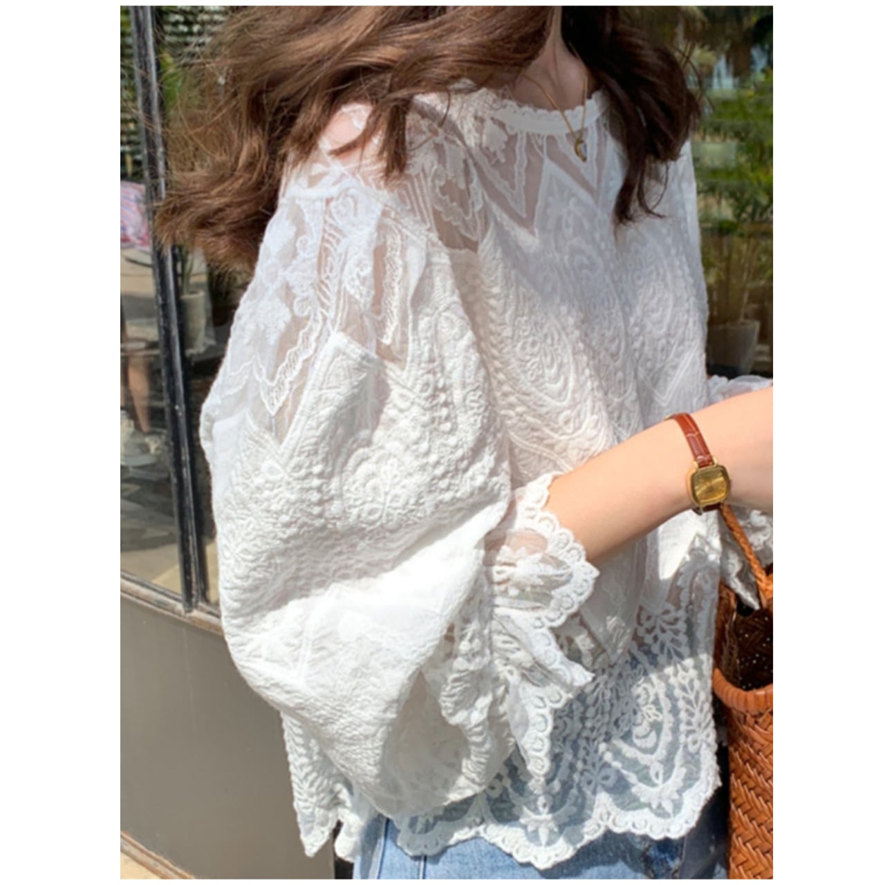 ボートネック刺繍バルーンスリーブ七分袖ブラウス 00579