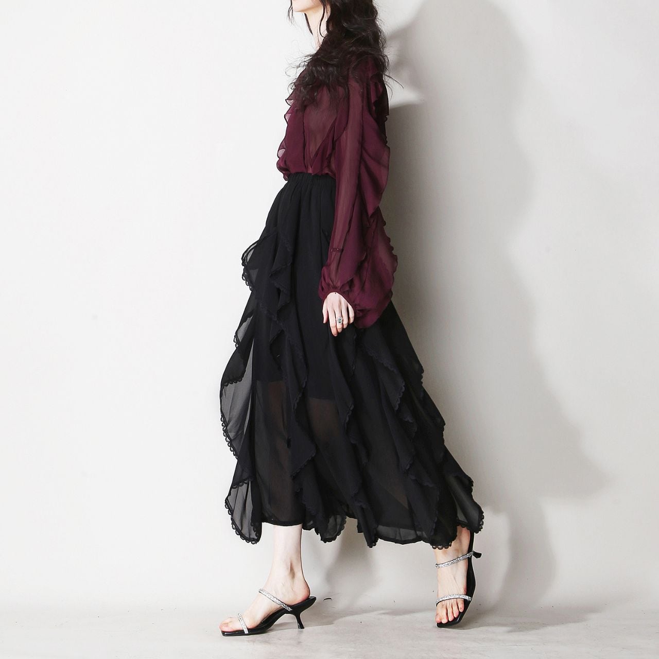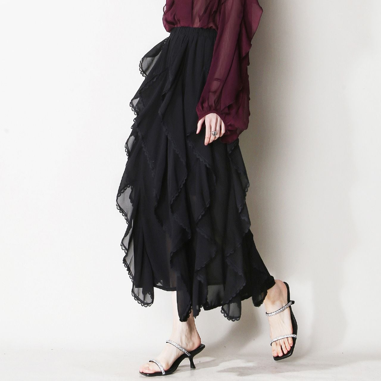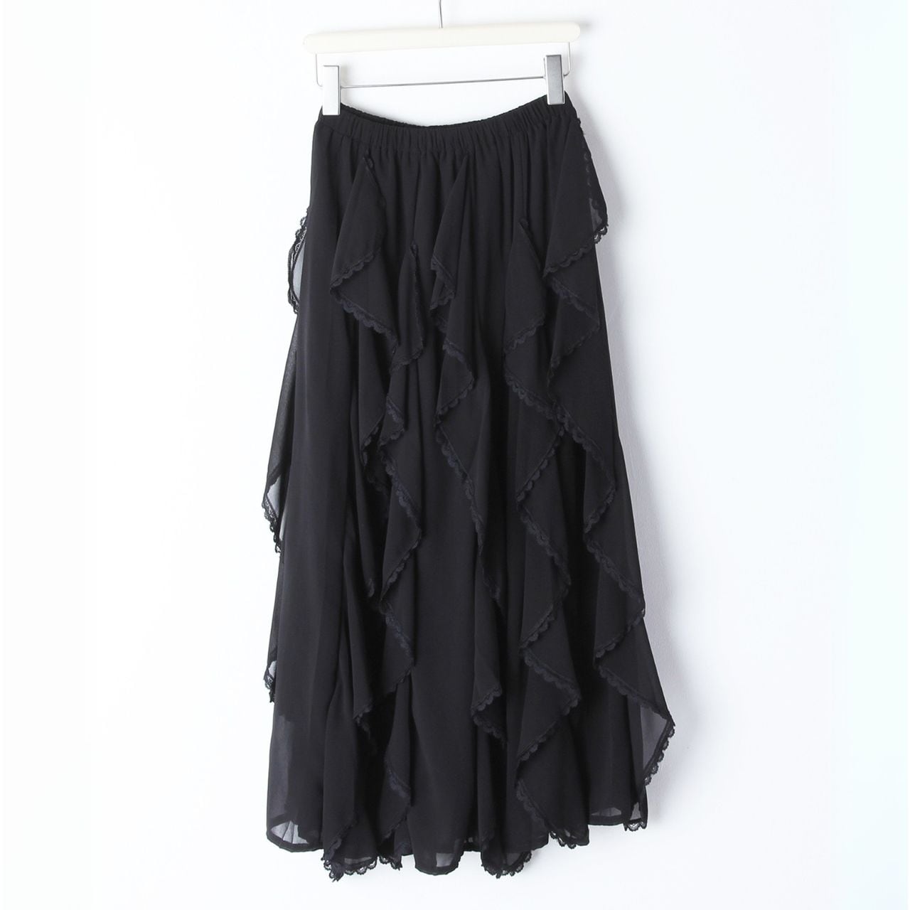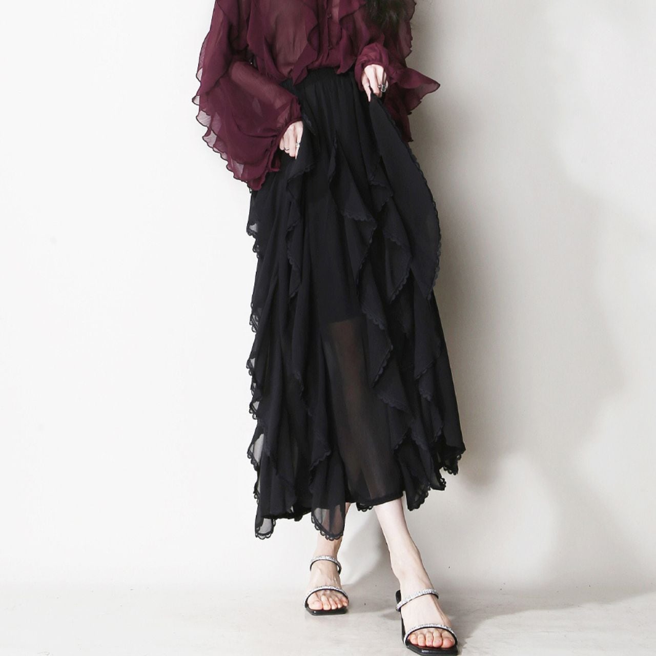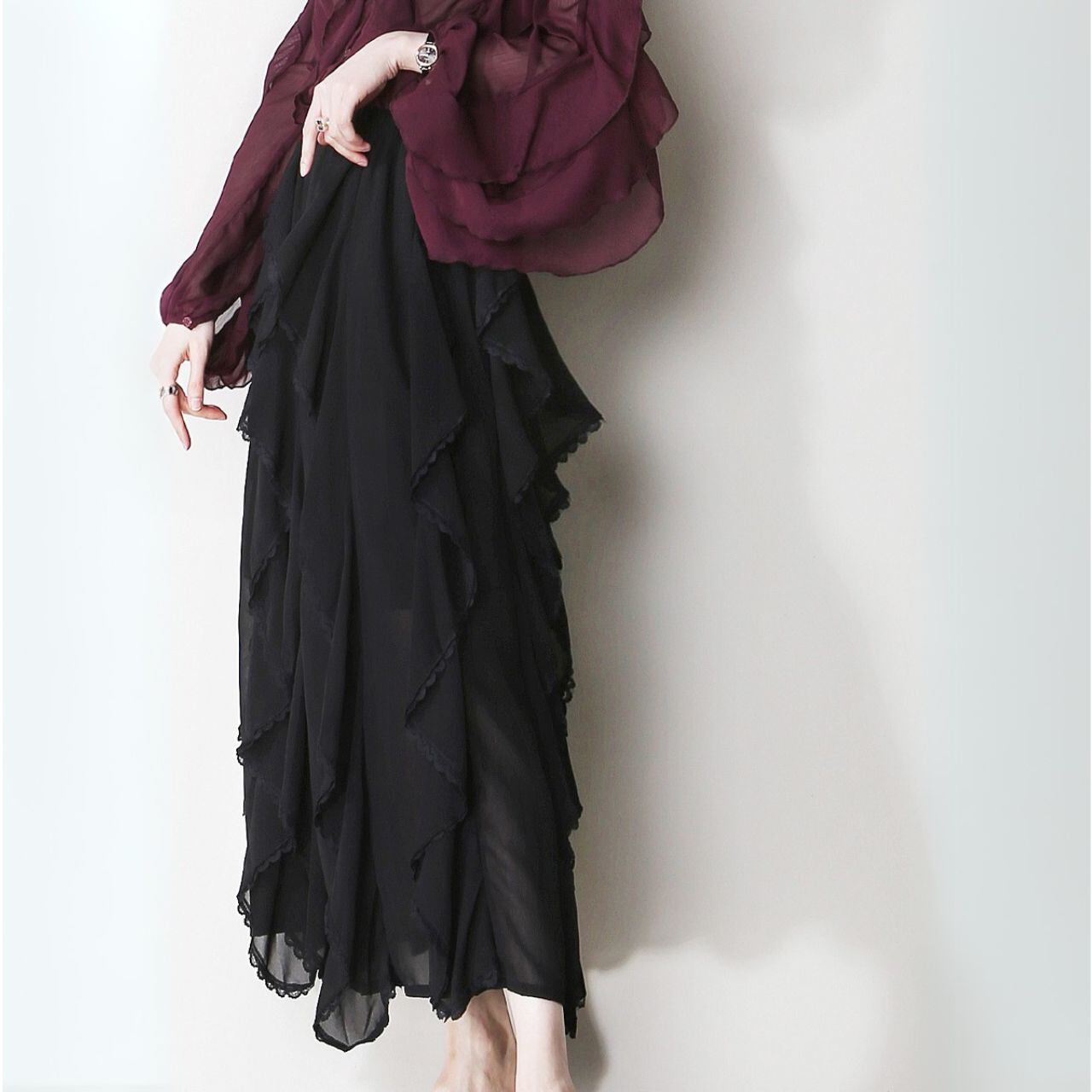 シアー素材レイヤードティアードミモレ丈スカート 00659