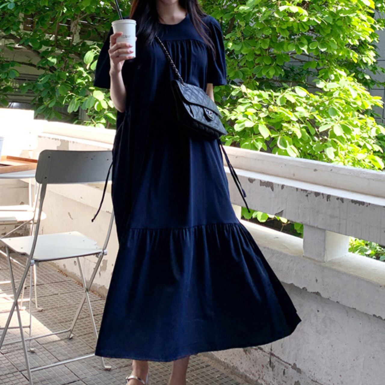 ウエストリボンフレアロングワンピース 00837