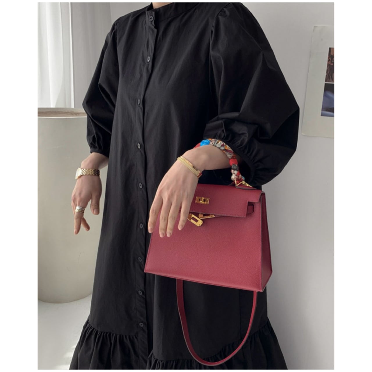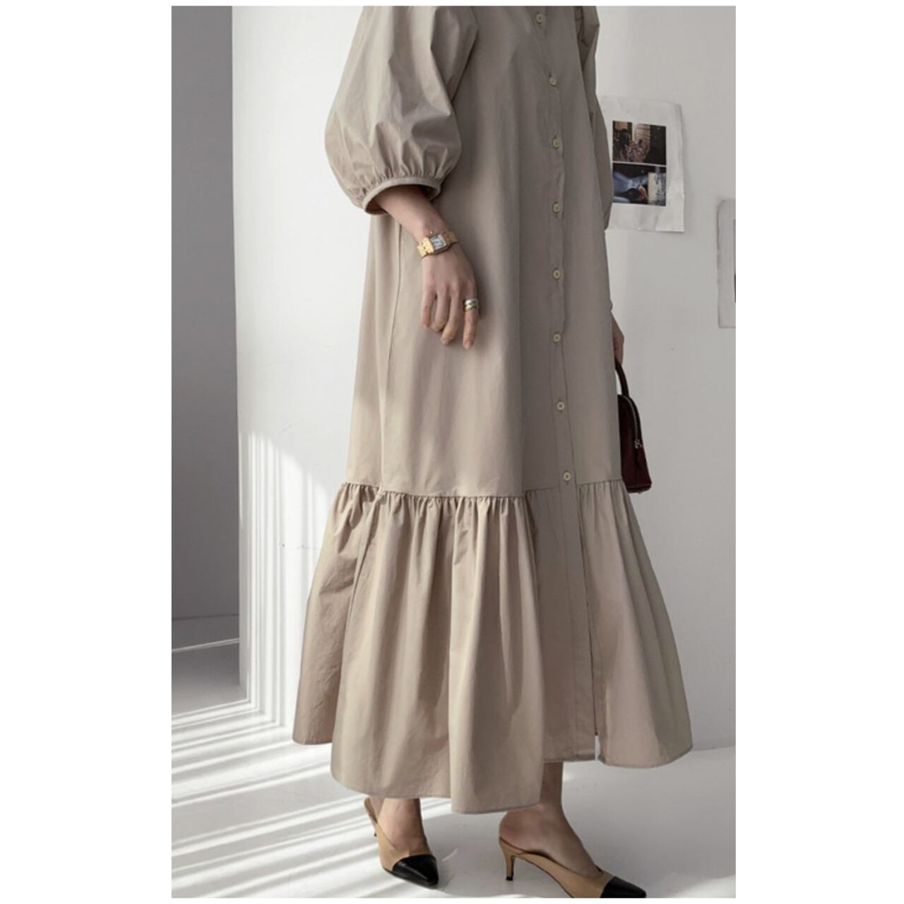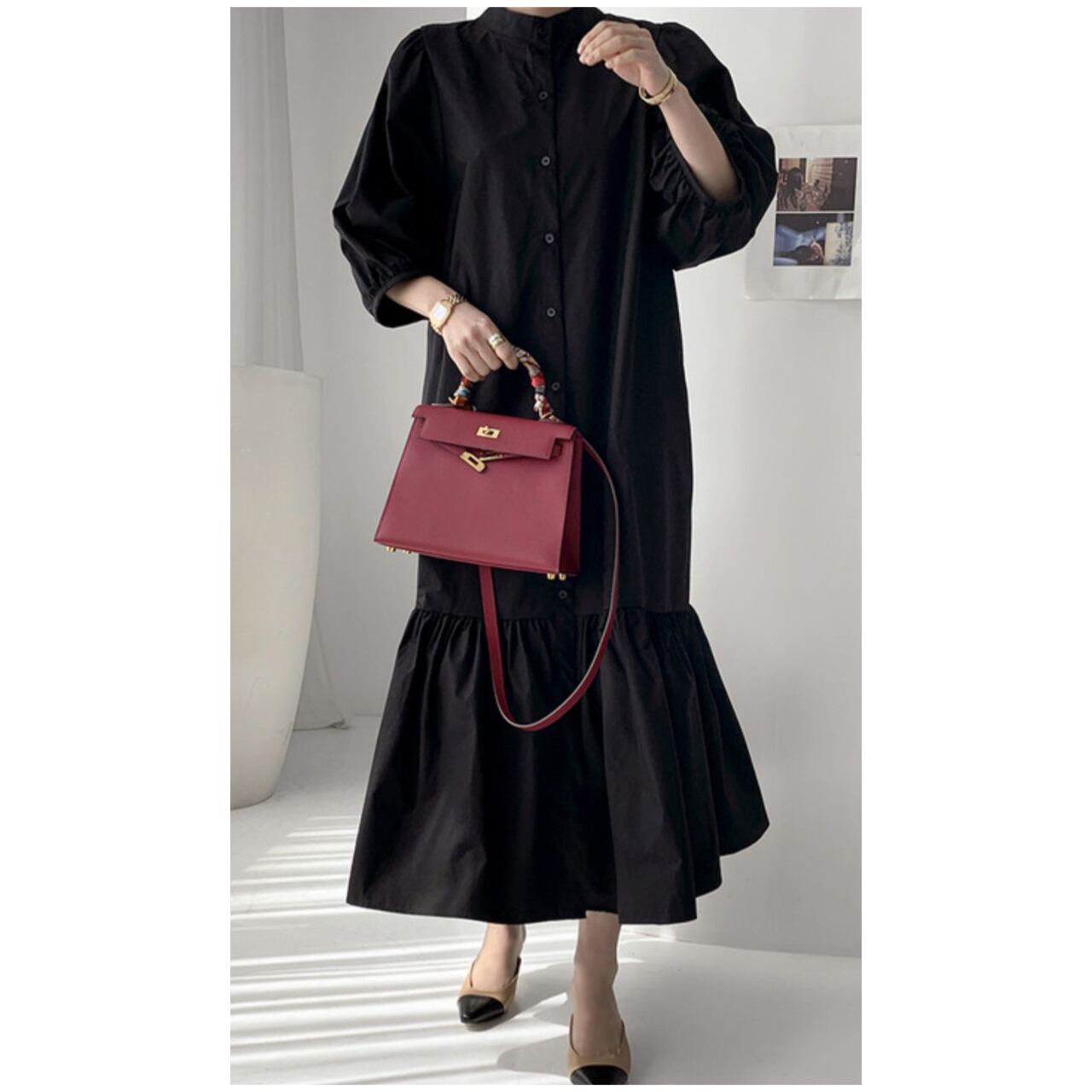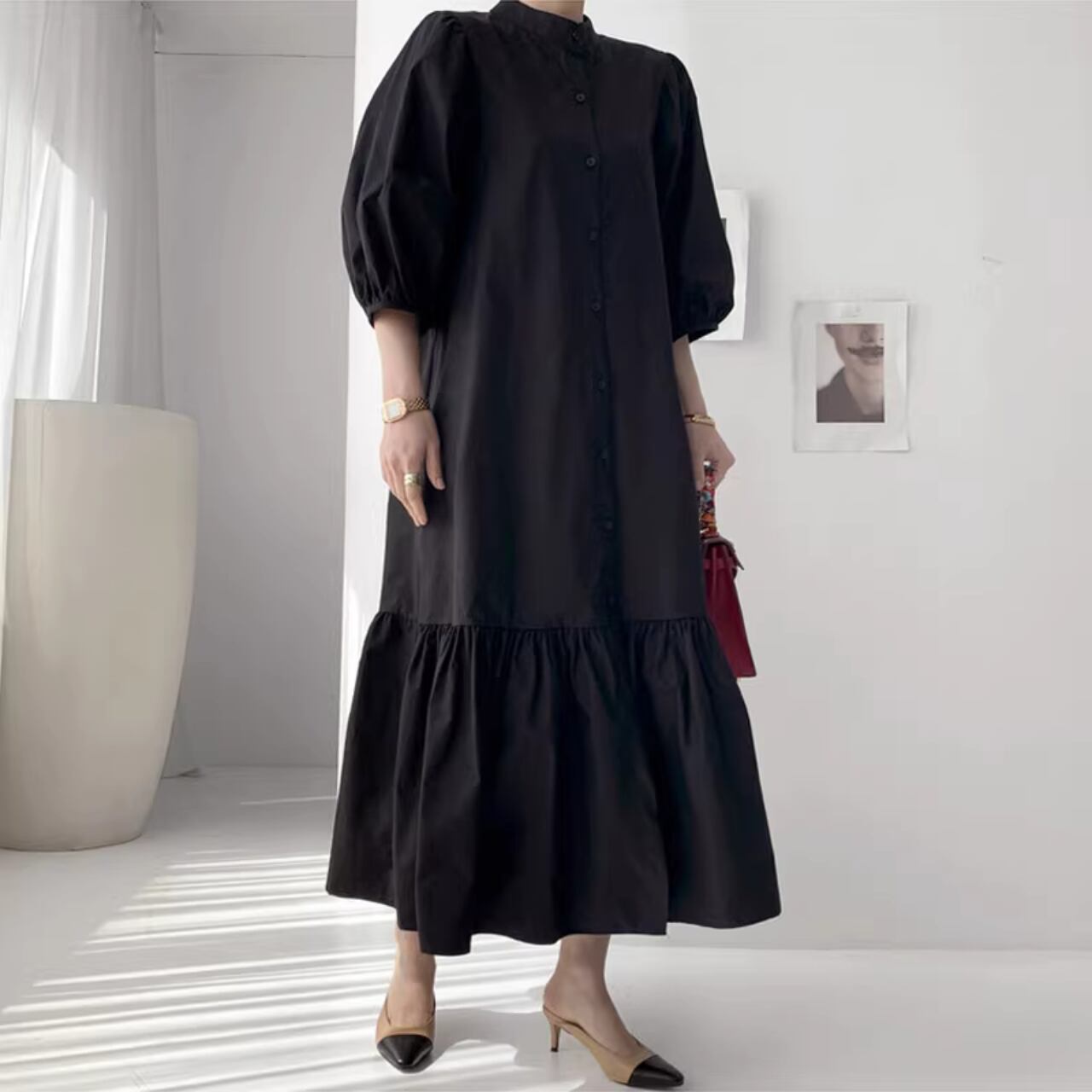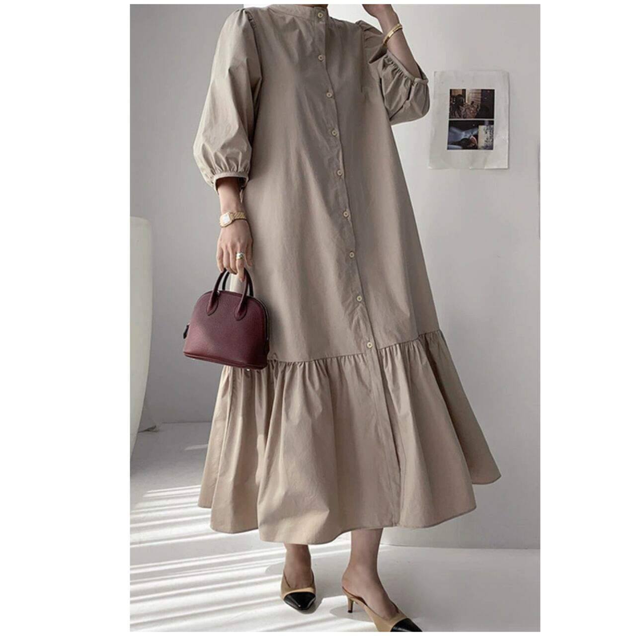 コットンスタンドカラー7分袖シャツワンピース 01010