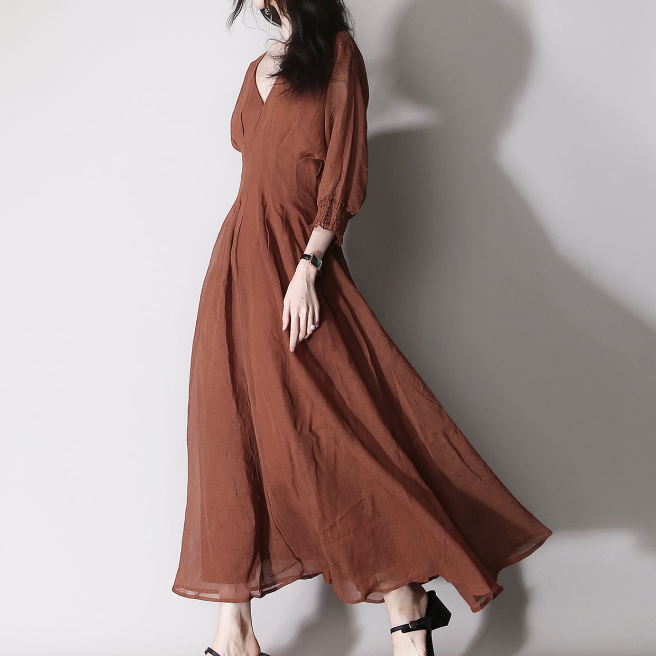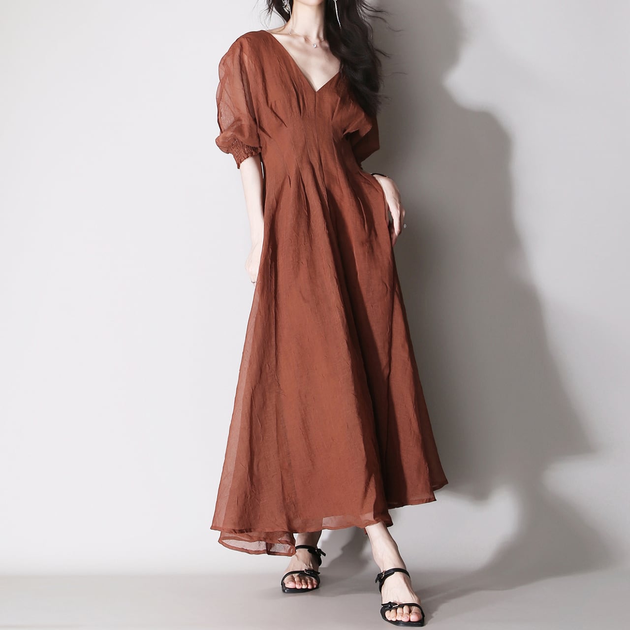 パフスリーブ Aラインマキシ丈ワンピース 01012