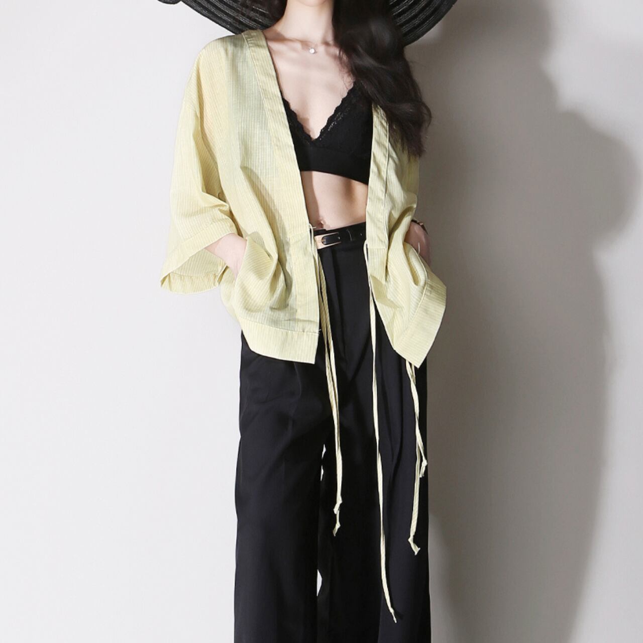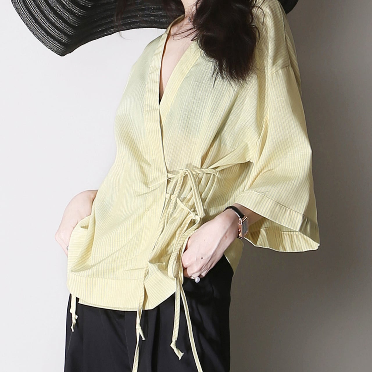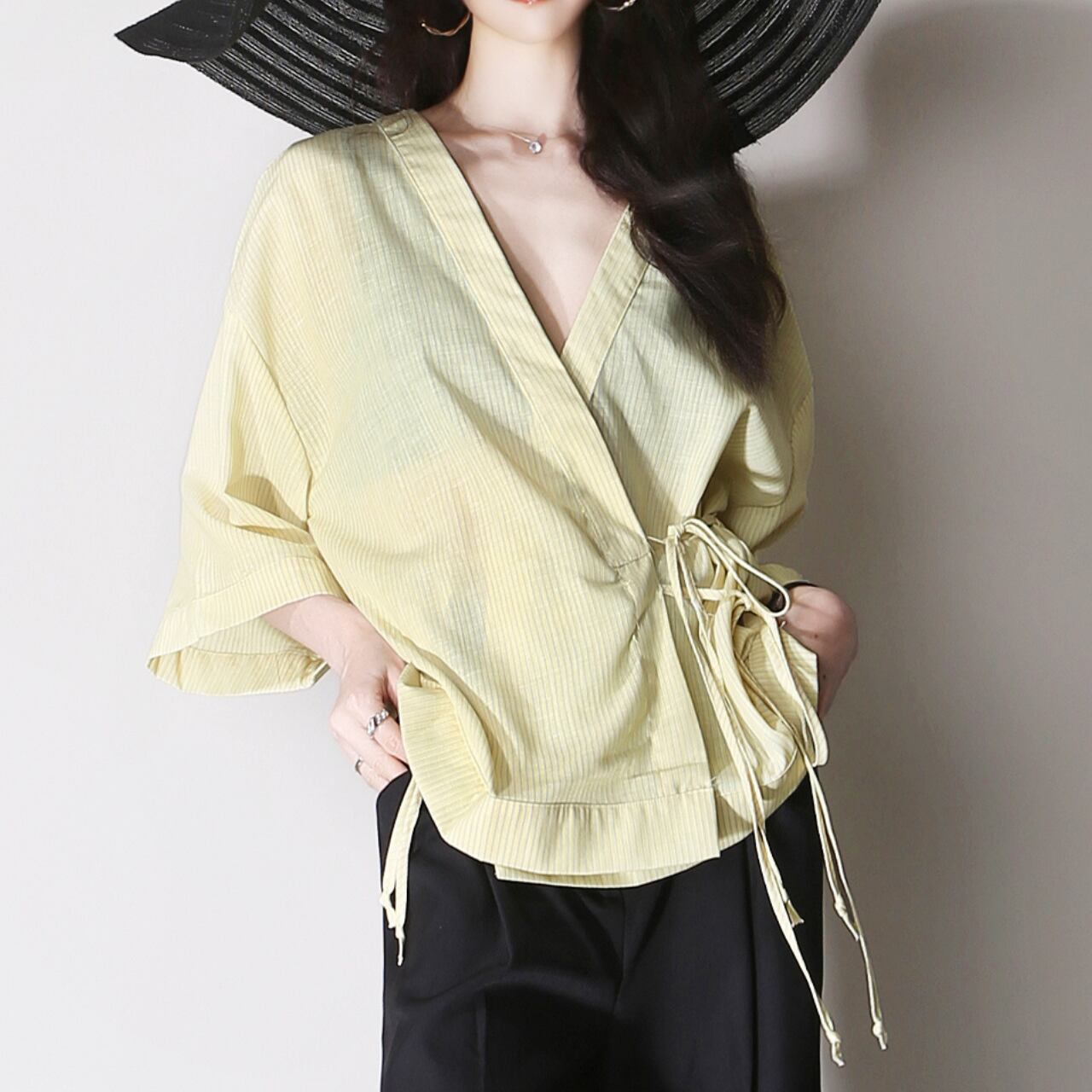 ストライプ柄七分袖Vネックラップシャツ 01017