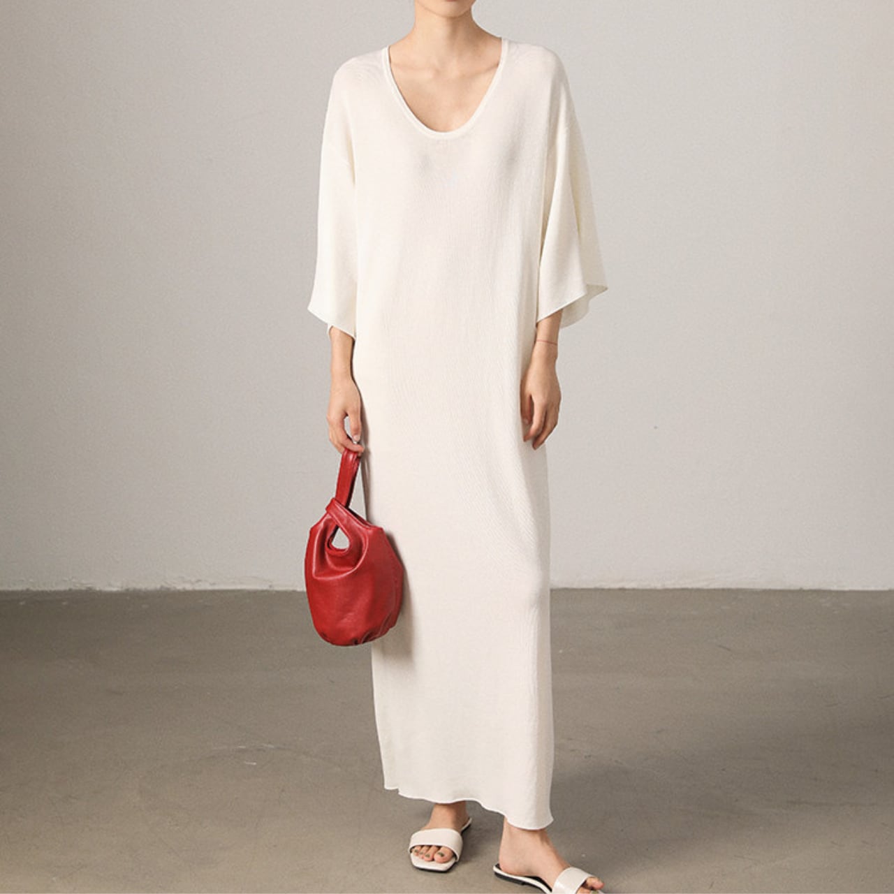 深Uネックの抜け感ロングワンピ。体型を拾わないゆったりシルエットで、一枚で完成する大人の春服。